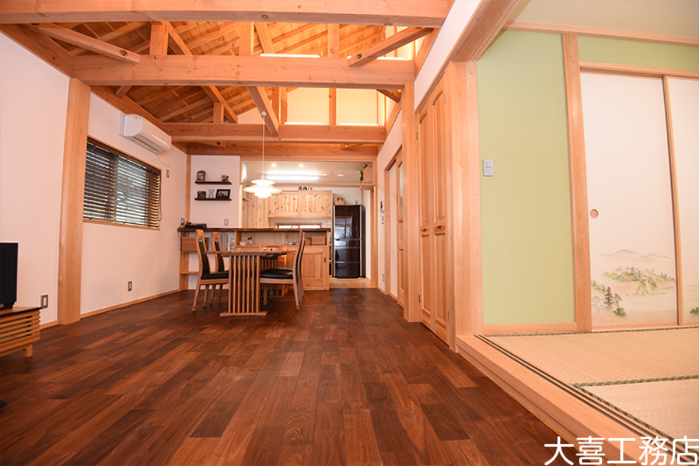 その他、数多くの自然乾燥をさせた極太の通し柱や太い梁などに囲まれた、断熱性能や耐震性にもこだわった空間を是非皆さまに見て頂きたいです。